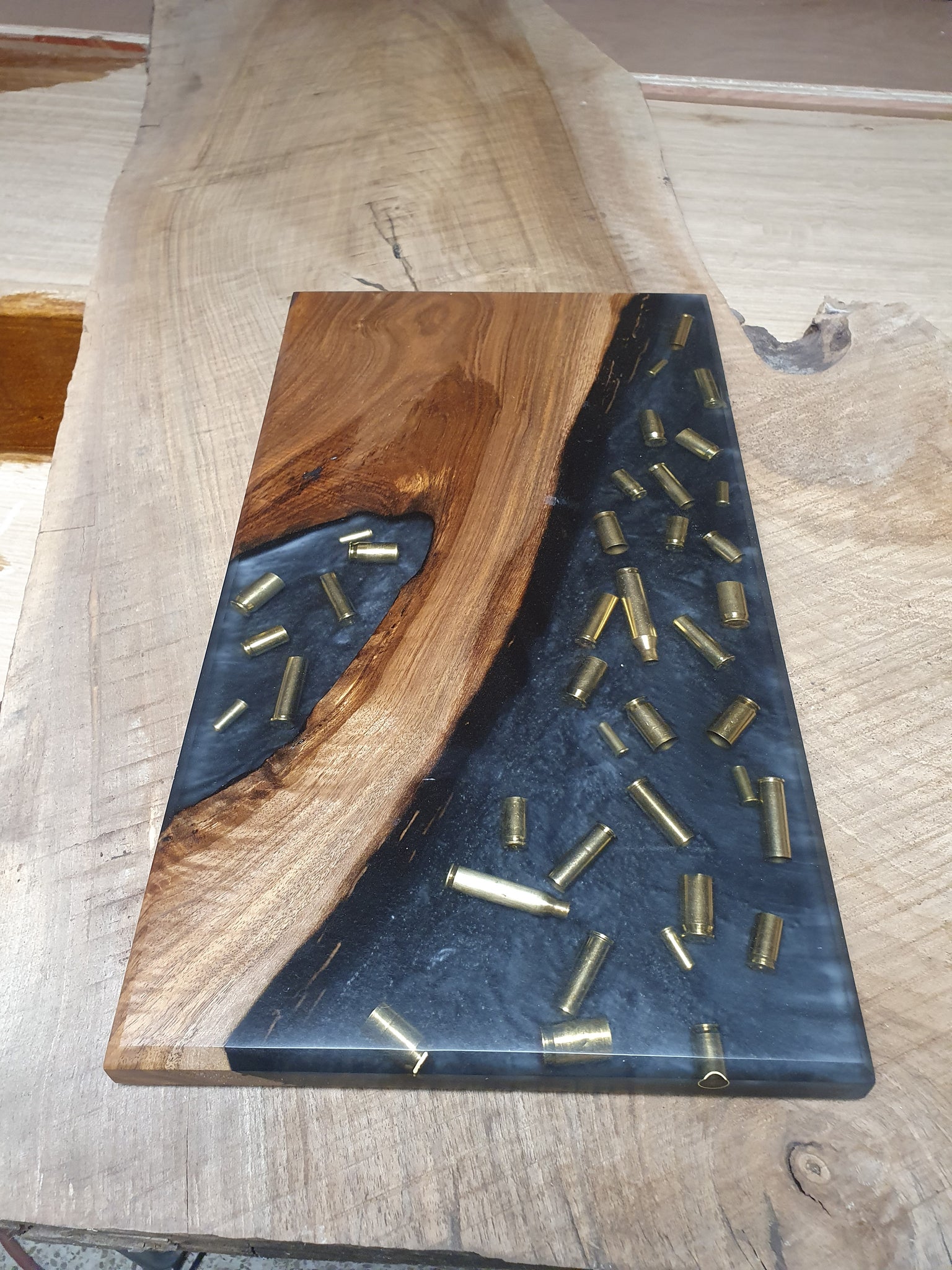 Ces magnifiques plateaux sont fabriqués à la main en noyer et en résine epoxy.